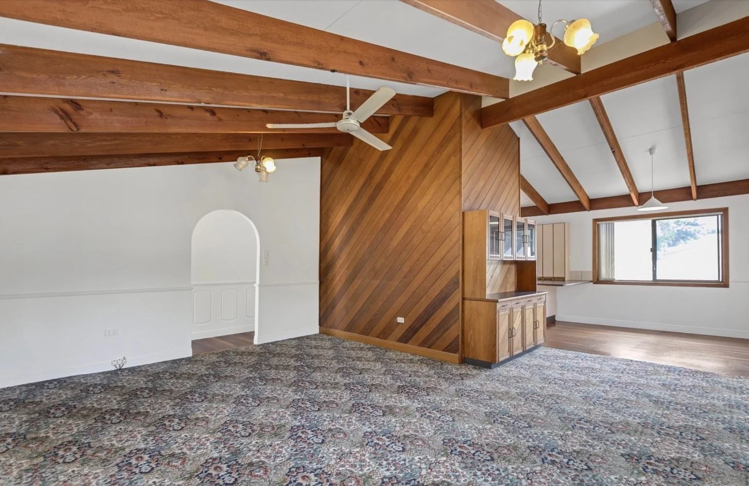 There is plenty of character to delight lovers of homes of this vintage with the retro kitchen and bathrooms, raked cathedral ceilings with exposed timber beams, an internal arch to the lounge, and timber flooring.