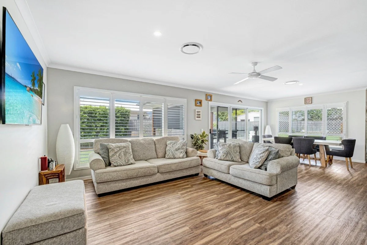 Three more large bedrooms, separate laundry, and well appointed main bathroom are located beyond the main kitchen which also opens up to a second living area. All bedrooms feature built-ins, ceiling fans, and plantation shutters.