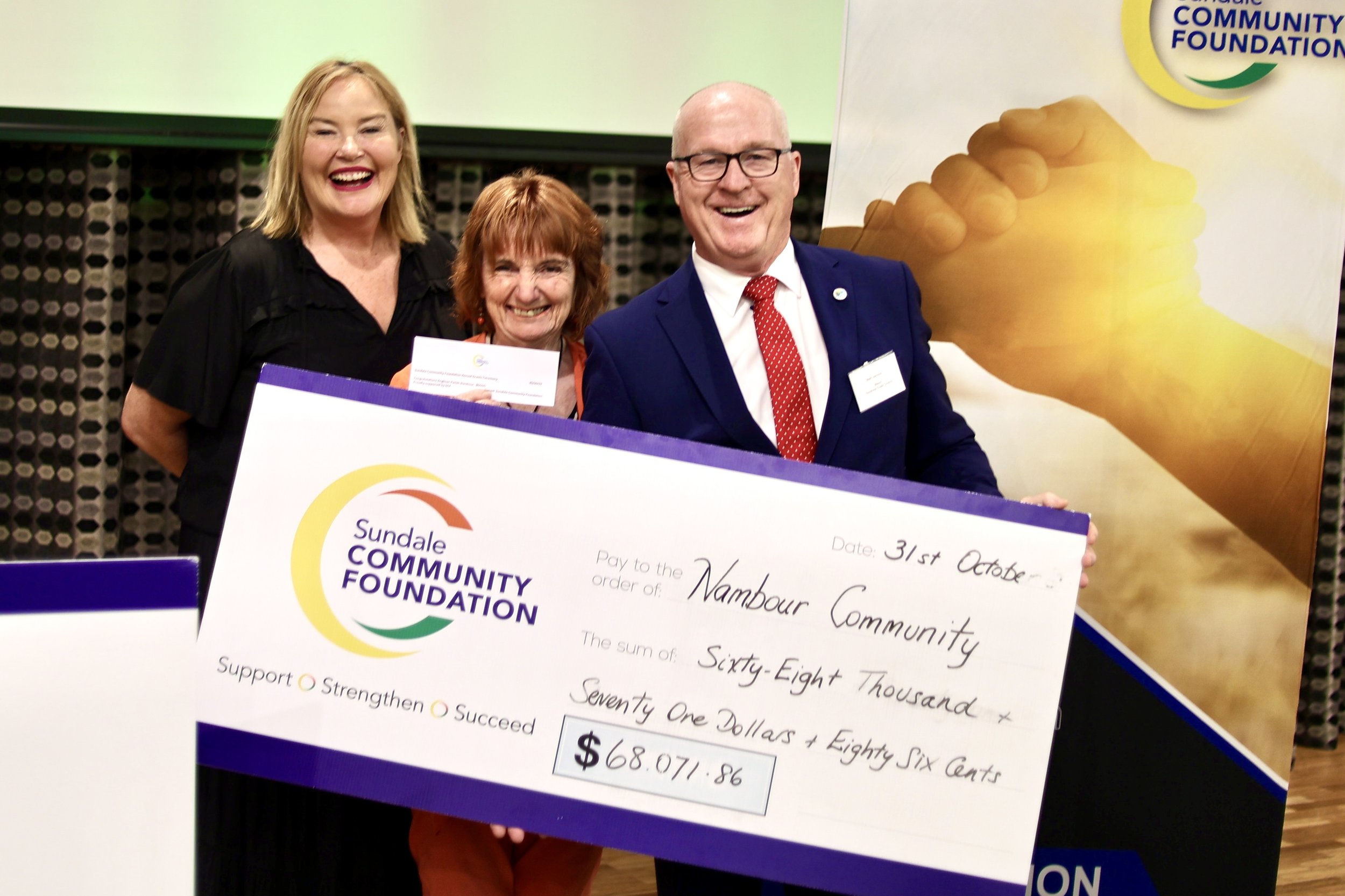 Mayor Mark Jamieson and Sundale Community Foundation Chair Caroline Hutchinson present a $5000 cheque to Anglican Parish Nambour’s Friday Night Burgers coordinator Coral McVean, centre, part of the total of over $68,000 given by the foundation.