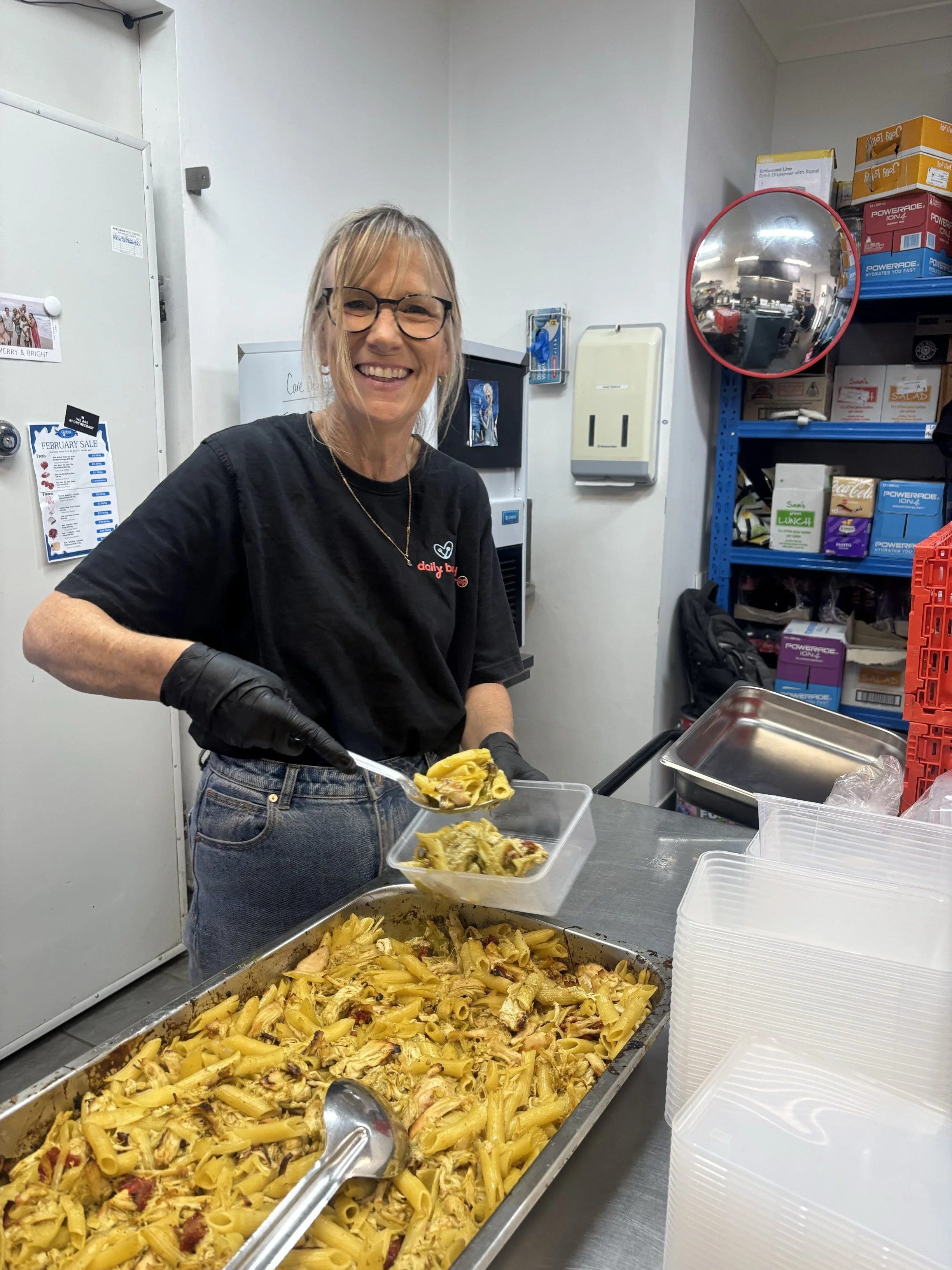 Daily Bread volunteer Laura Reid prepares hot meals to deliver to the Nambour Showgrounds.