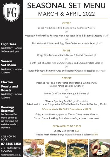 Delicious local Seasonal Set Menus return to Flaxton Gardens