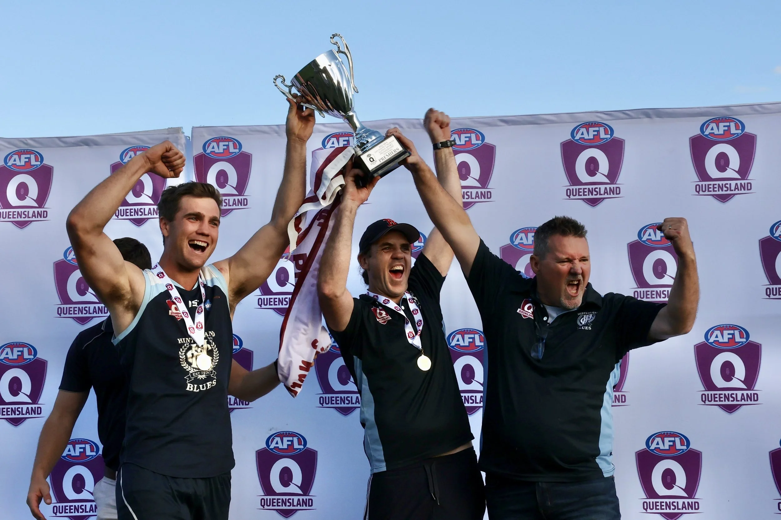 Hinterland Blues Captain Callum Mann, Coach Phil Birchmore and President Bruce Bell lift the trophy after winning the QFA North Div 2 Grand Final.