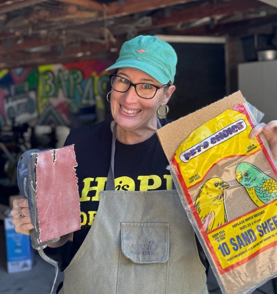 Gav tapped me on the shoulder, I stopped the sander, and he asked me ‘How are you going with it?’ I said I thought it was coming up nicely, but he didn’t seem so sure. I lifted the sander and inspected the sanding sheet. It was almost gone! It had just disintegrated. He asked me to show him where I got the sanding sheets from. We both stood there at the table, I rifled through a few packets and found the one I had taken my sheet from. As I turned it over, a picture of a budgie was on the front of the packet. I looked at Gav, he was smiling the biggest smile ever. In my enthusiasm, I had in fact grabbed the sand sheets that line the bottom of bird cages! We both roared with laughter and joked that no one will be following me for DIY tips! Ha.