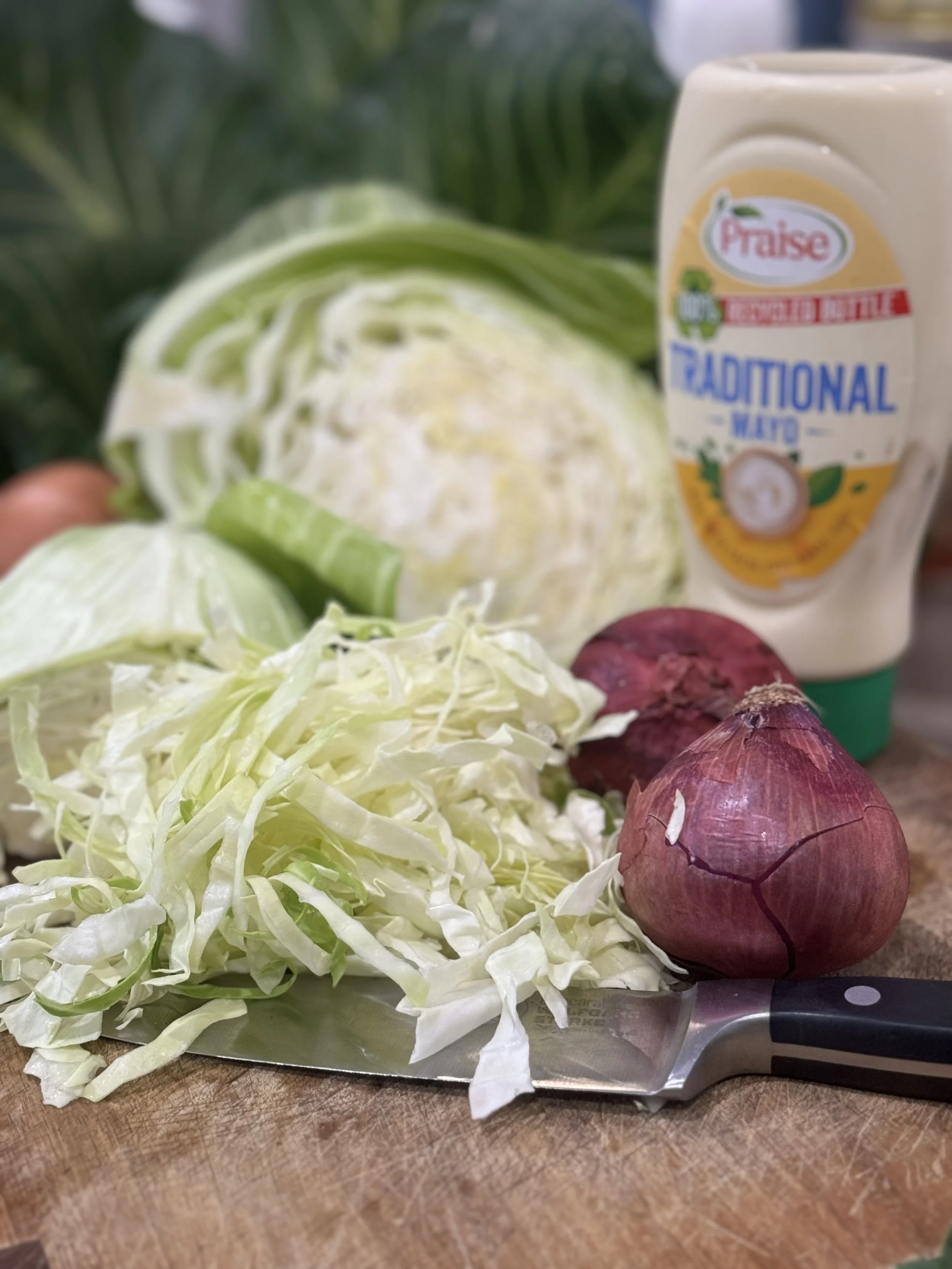 Buy a lovely fresh cabbage from the fruit shop (I like Fruity Life in Howard St, Nambour the best), or even better if you have grown one yourself in the garden. Cut it in half and then slice one half very finely and put into a bowl. Add a grated carrot and some finely diced red onion. Mix through a nice lot of mayonnaise and it is ready to serve. Now it will taste so good today, but tomorrow it will taste even better as the flavours meld together. You can also add some finely diced capsicum, snow peas etc. Coleslaw is really a cabbage salad, so you can get creative and make it how you want. It is a terrific side dish to have with any sort of meat. Coleslaw will last a few days in the fridge, but it is easy to make, so you can prepare fresh batches in a flash.