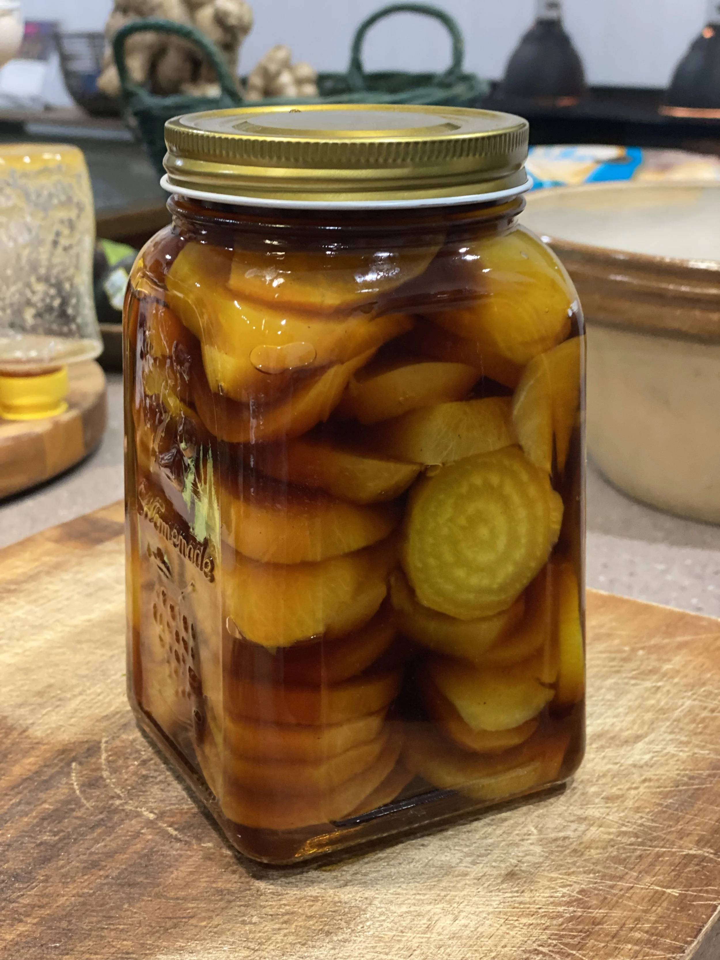 We just love golden beetroot and it is delicious pickled to enjoy as we fancy. Quick pickling is so easy and you can get creative with the vinegars and spices you use. Experiment and see what flavours your family like. Consider garlic, red pepper flakes, ginger, peppercorns, fresh dill, thyme etc as flavouring agents for your brine. Fresh herbs, dried herbs, whole spices and ground spices are all great to use. Start out slowly, seeing what flavours you like.