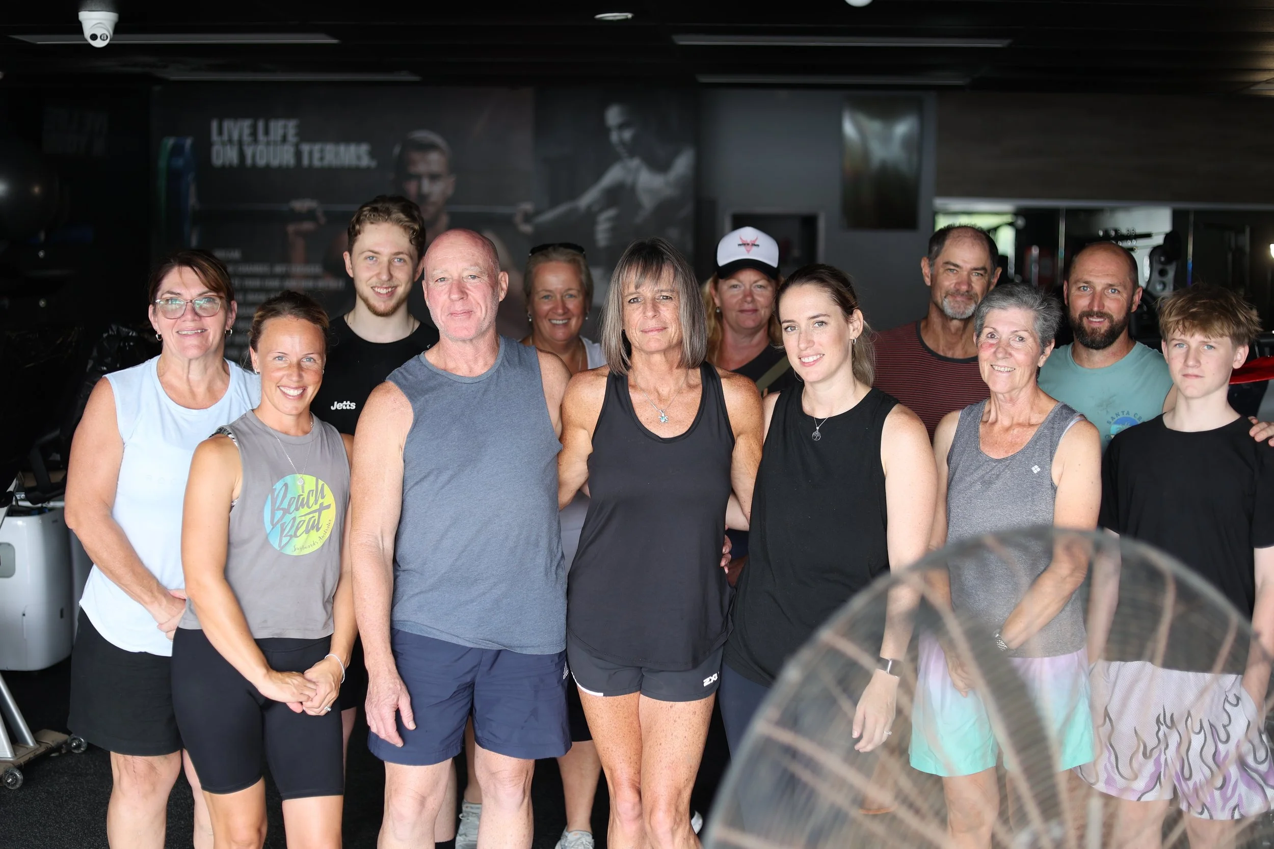 Jetts Nambour owners Warren White and Jill Bingham, centre, and some of the helpers who pitched in. They gym has copped over $100,000 damage.