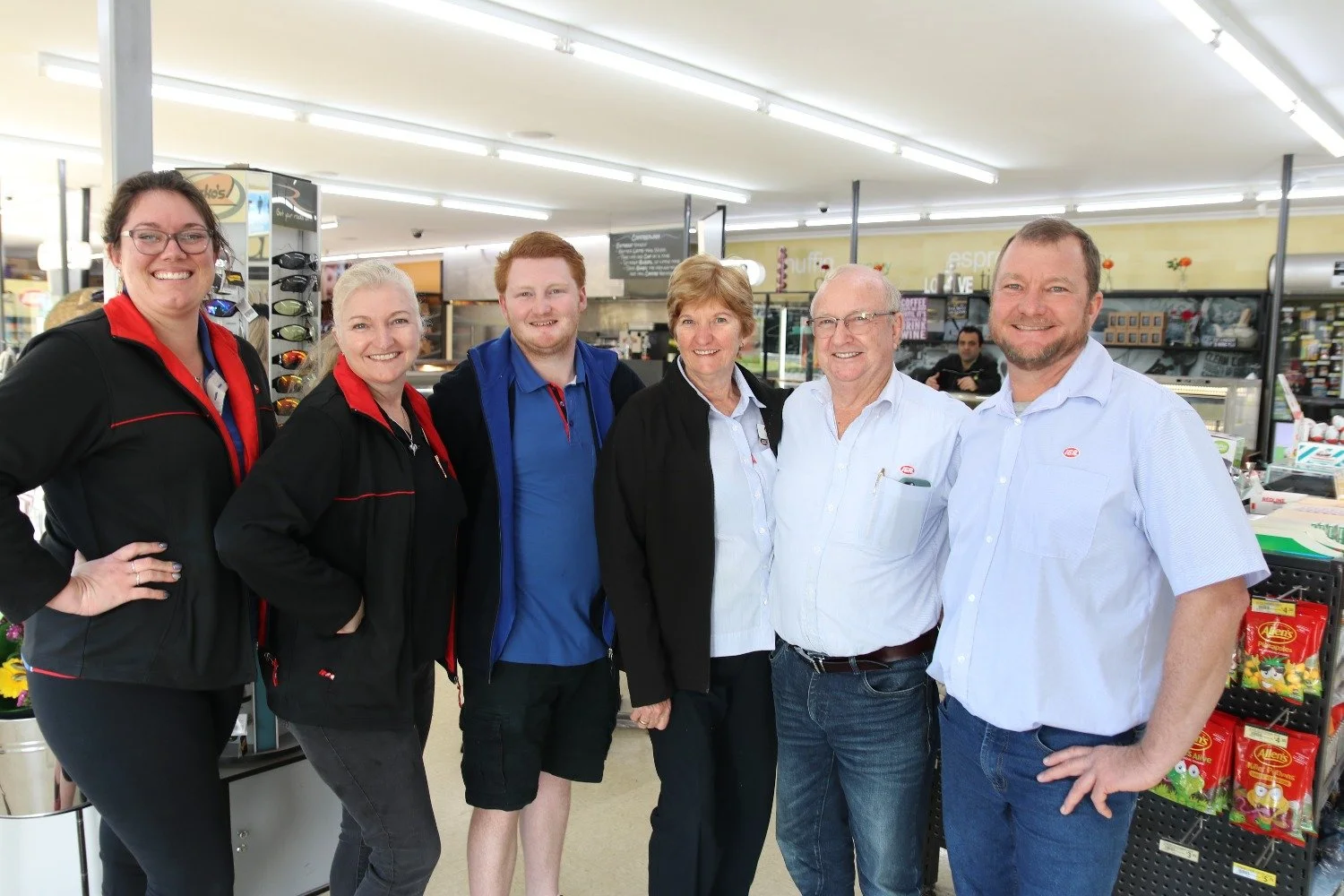 The Mapleton IGA and Post Office team includes, from left: Esther Anderson, Marianne Fenton, Brendan Anderson, owners Linda & Kelly Anderson and Kel Anderson: “We are hoping we can give the same great service Elizabeth and David have given over the last 18 years.”