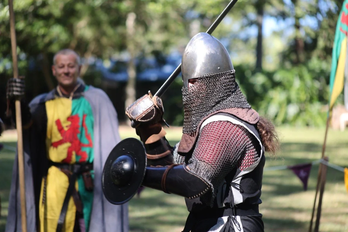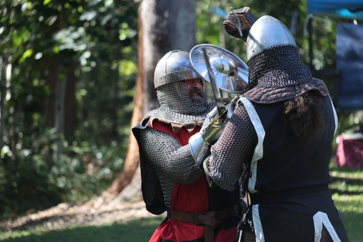 “We accept people with all levels of interest — from people who want to just dress in period clothing and hang out at the ‘Village’ and learn medieval craft activities, right up to tournament level competition fighters. We have recently made an alliance with the Sunshine Coast Vultures. This group fight in a Buhurt competition league which is a world-wide sport. Think judo, but with armour and swords.”