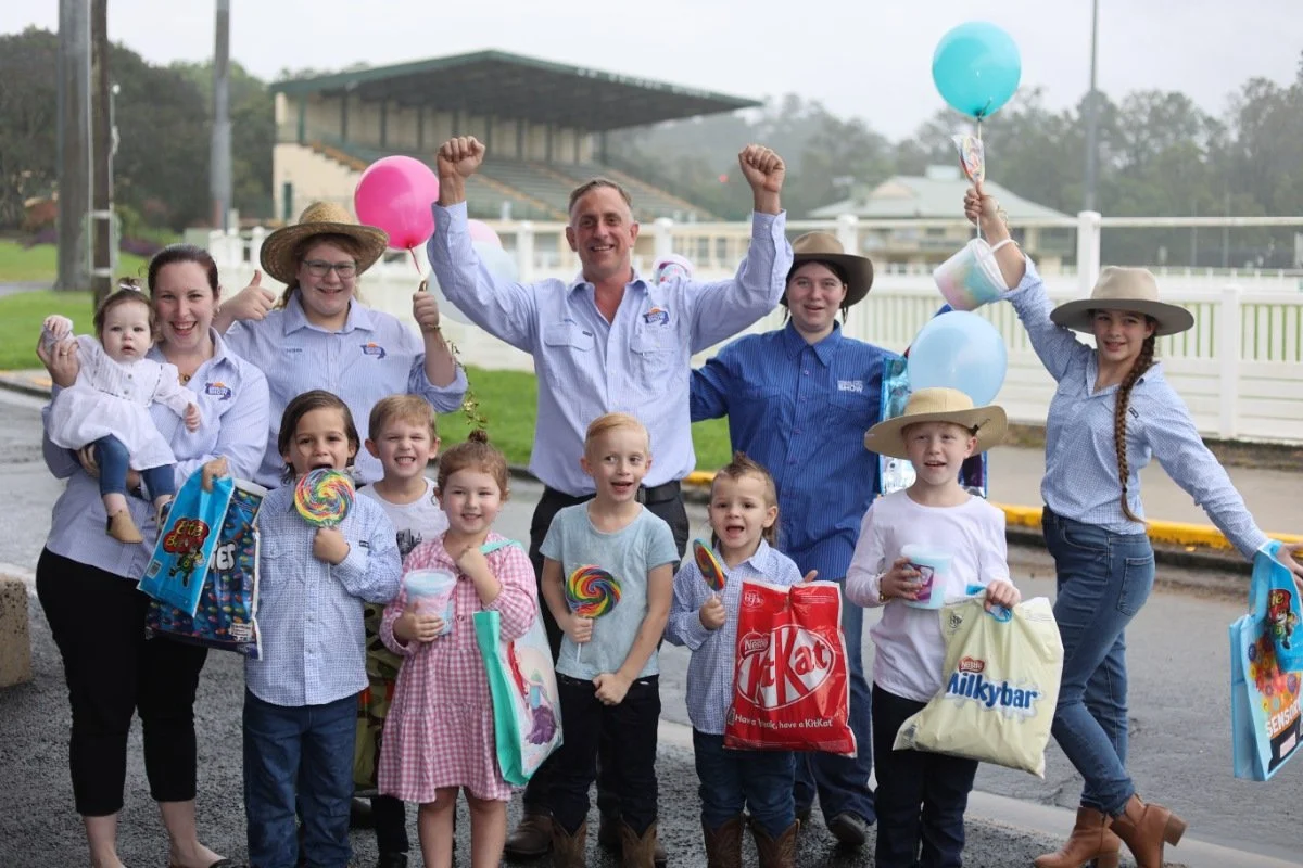 Show Society President Rowan O’Hara is surrounded by kids and parents who can’t wait to go to the Show — the theme of which this year is “Country to Coast Together We Are Stronger”.