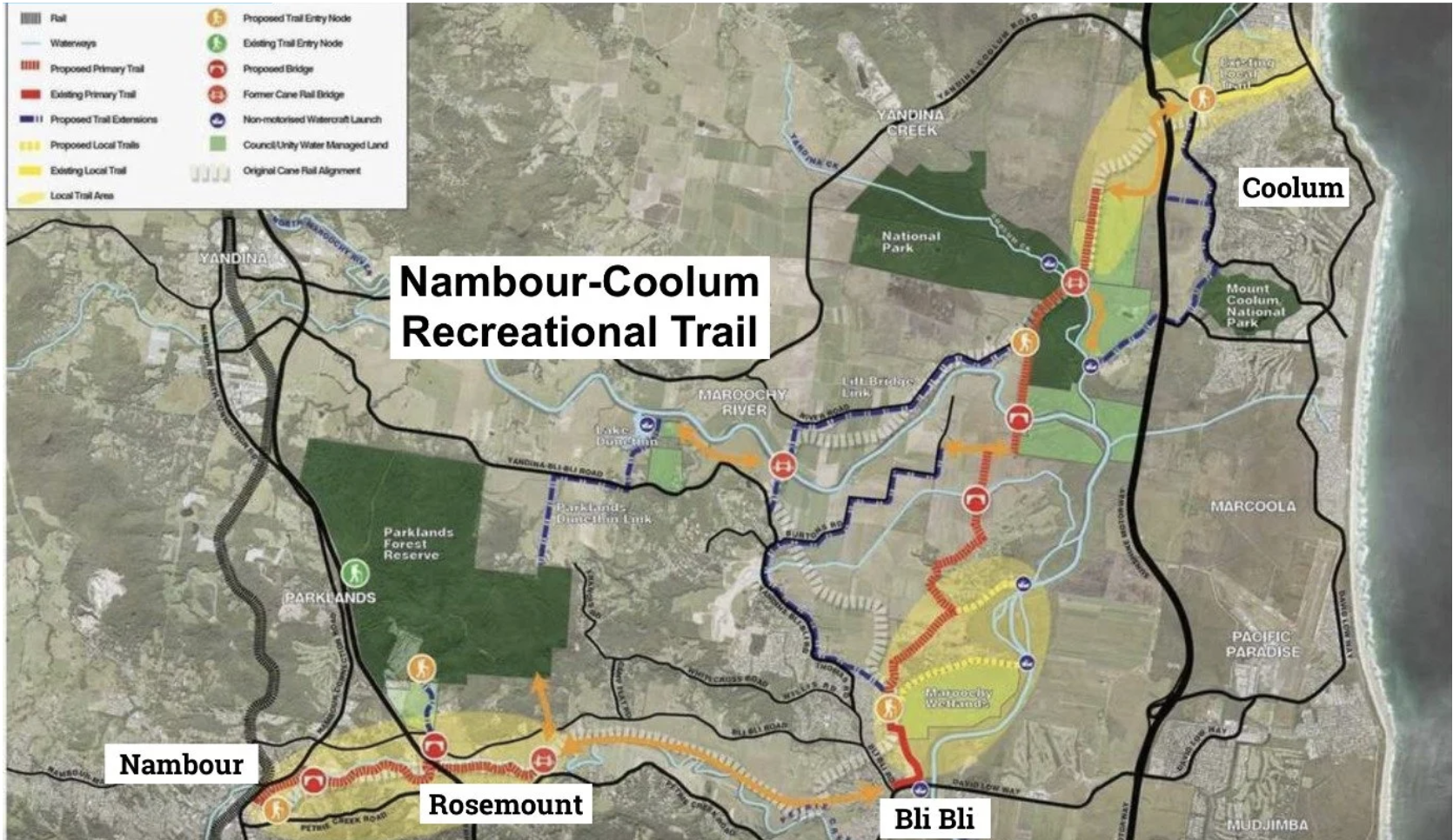 The proposed trail, first endorsed by council in 2017, would span up to 48km linking Nambour, Rosemount, Bli Bli and Coolum, with about 16km following sections of the historic cane train line. Advocates say it would boost recreation, tourism and active transport while better connecting the hinterland to the coast.