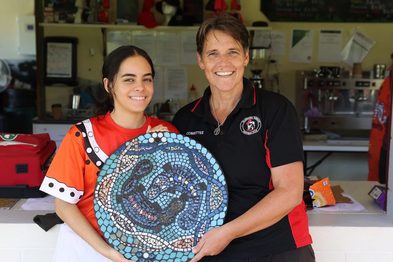 Palmwoods Warriors Football Club President Tarryn Powell, right, presents Evangeline with a gift for her work designing the jerseys.
