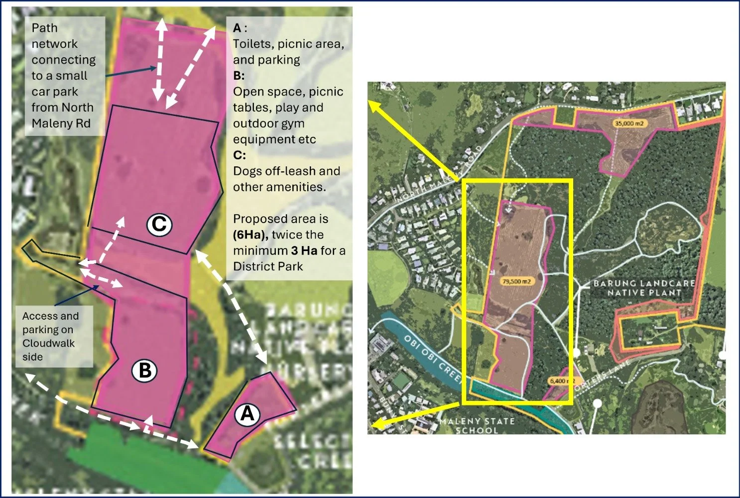 The proposed park would include a path network connected to a small car park on North Maleny Road. One area (A) would feature toilets, BBQ facilities, and parking. Another large flat area (B) would offer open space, playgrounds, and outdoor gym equipment. A third area (C) would be designated for dogs and other amenities, with access and parking also provided from Cloudwalk estate.