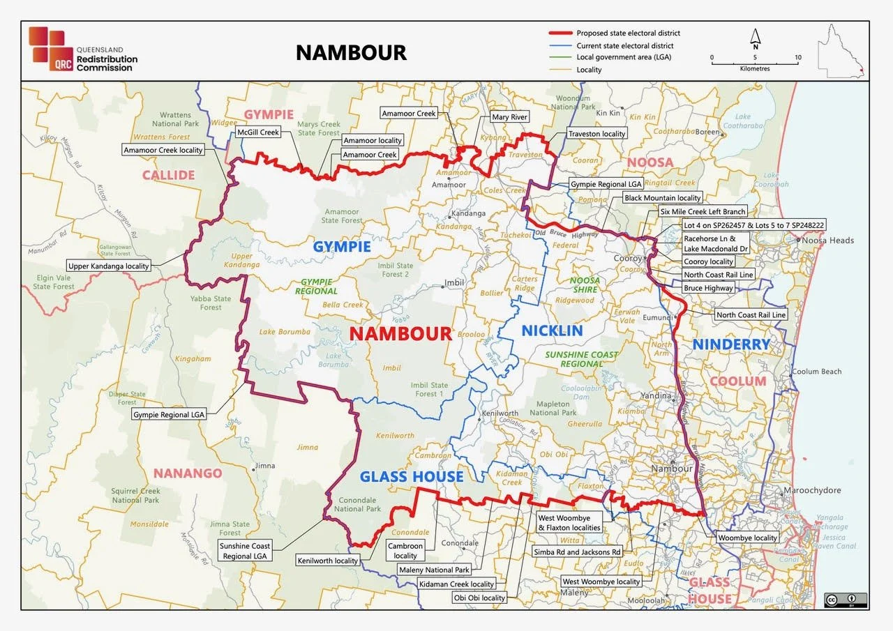 The Nicklin electorate is set to be renamed Nambour and significantly reshaped under a proposed redistribution that will redraw Sunshine Coast political boundaries ahead of the 2028 state election.