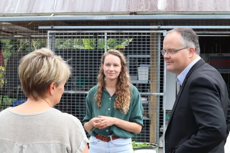 Ted O’Brien chats with Project Officer Emily Boyd, centre, and Yandina Community Gardens President Colleen Bichel.