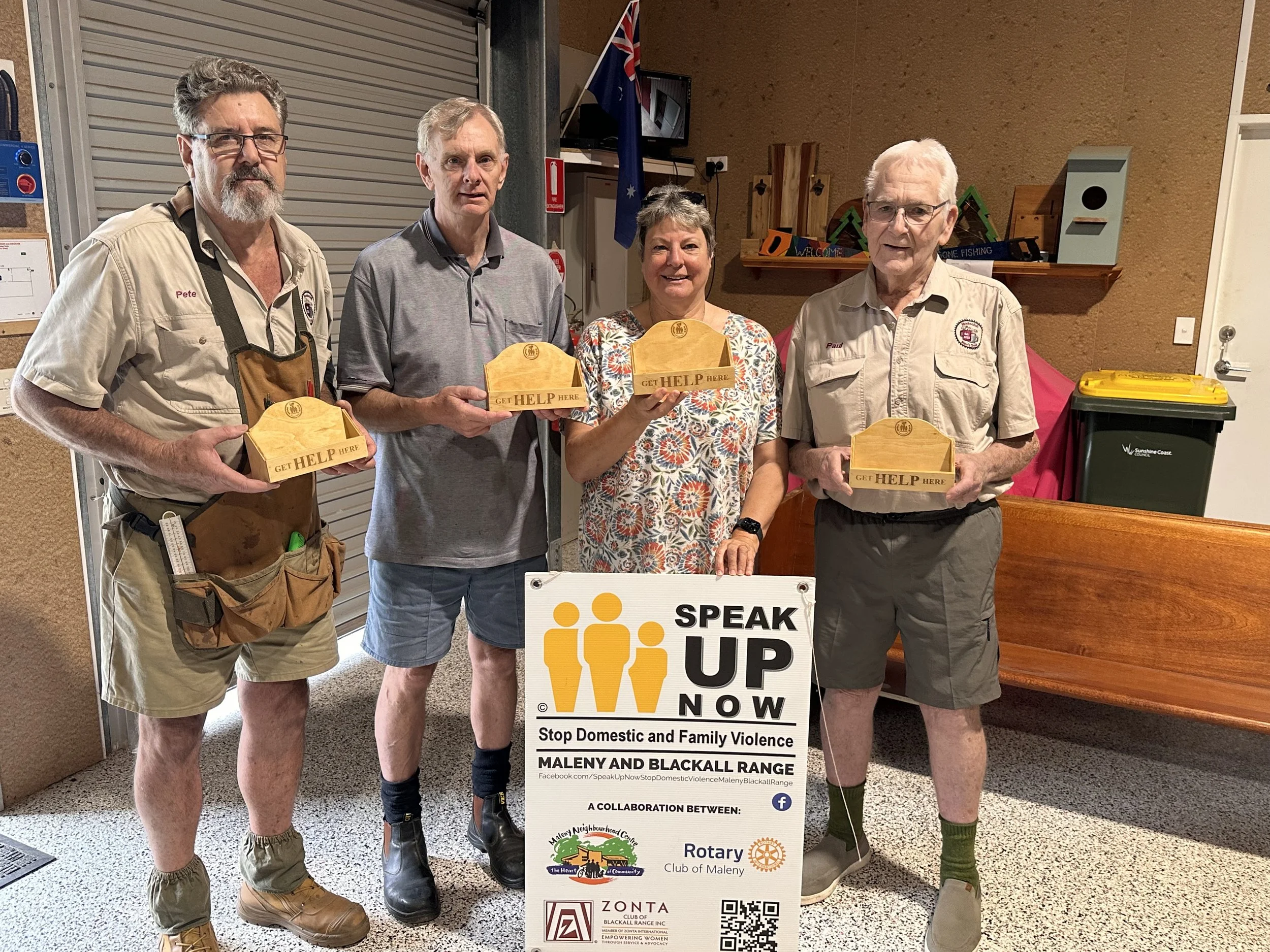 The project originated after Speak Up Now delivered a presentation to members of the Mooloolah Valley Men’s Shed about the important role respected senior men can play in preventing and responding to domestic and family violence. The thoughtful discussion that followed led to the creation of a simple but powerful idea: a discreet, visible holder offering immediate access to safety cards and support contacts.