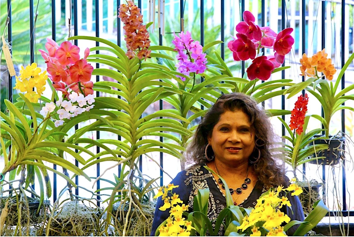 Rita Hand is surrounded by the wonderful colour of the Vanda Orchids grown by Richard Hand, who is editor of the Nambour Orchid Society’s monthly newsletter.