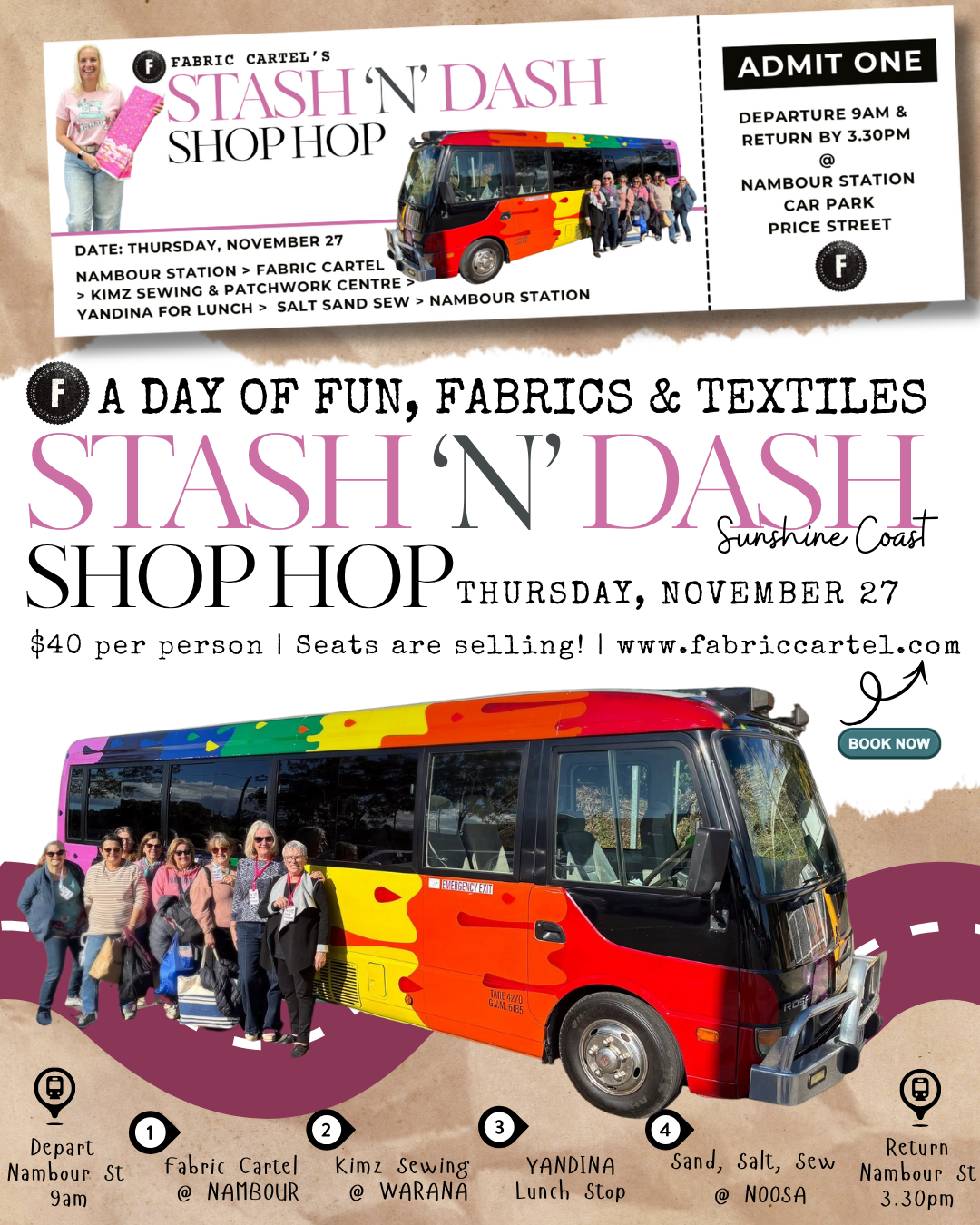 Fabric enthusiasts are in for a treat this November as Fabric Cartel hosts the Stash & Dash Shop Hop - a vibrant bus tour celebrating creativity, community, and connection across the Sunshine Coast’s most loved sewing destinations.