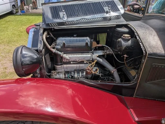 Accommodation proved to be scarce in Narrabri but with assistance from a family-owned motel group this was overcome. This family was delighted to view the Lambda and eager to be photographed with it. Next morning a gentleman from the Narrabri Antique Car Club was found closely inspecting the car. This long, dark, regal vehicle covered in a leather like fabric, with red metal mudguards, a shiny nickel-plated radiator cowl, flip back second row seats, deep red leather upholstery complemented by red fabric window blinds with tassel pulls and crystal vases positioned at the rear windows, is certainly capable of arousing intense interest.