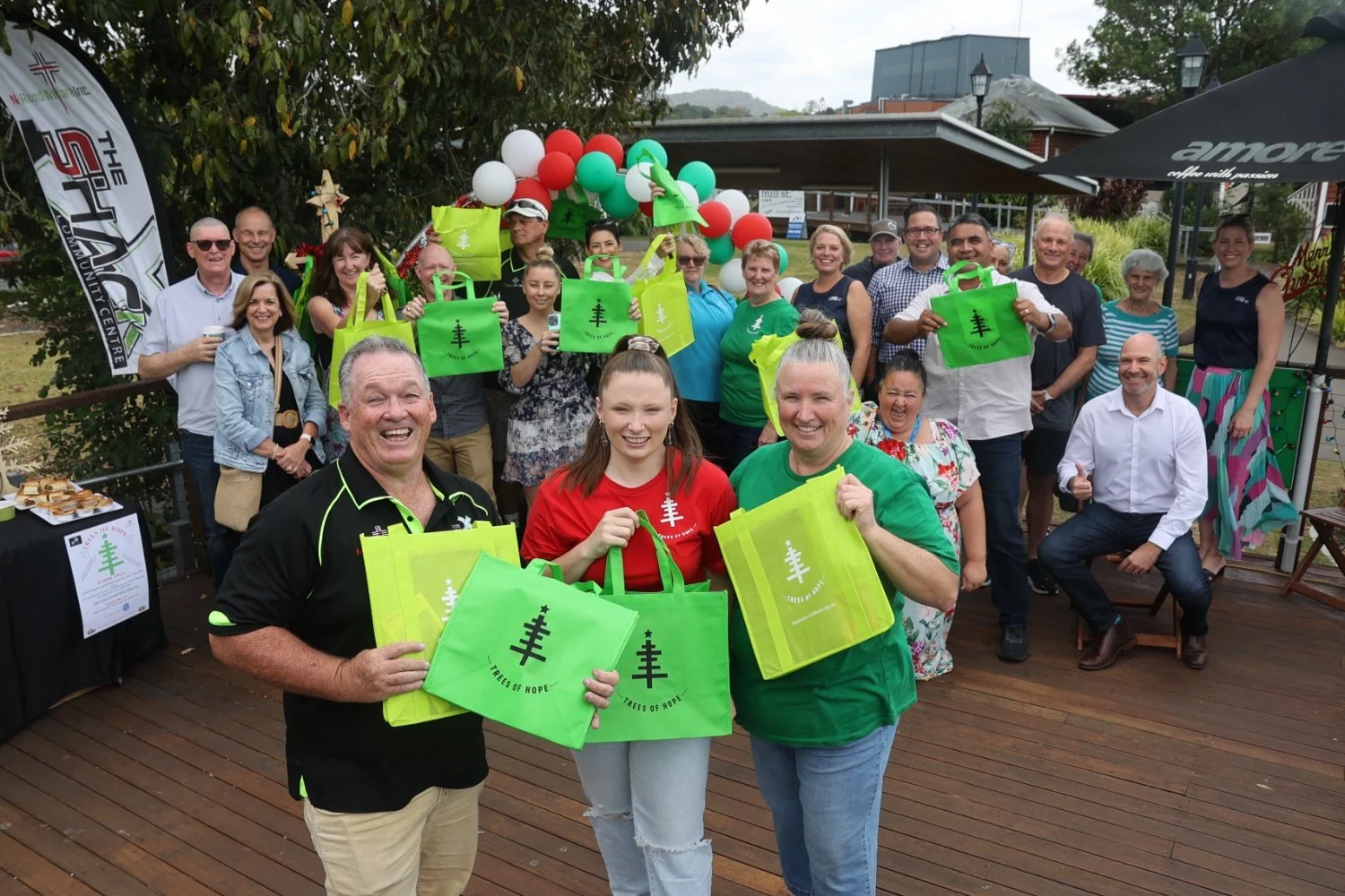 The Shack’s Dale, Imogene and Donna Dowler, backed by supporters, launch the Trees of Hope Appeal. Just call in to participating stores, grab a hamper bag and fill it according to the list provided.