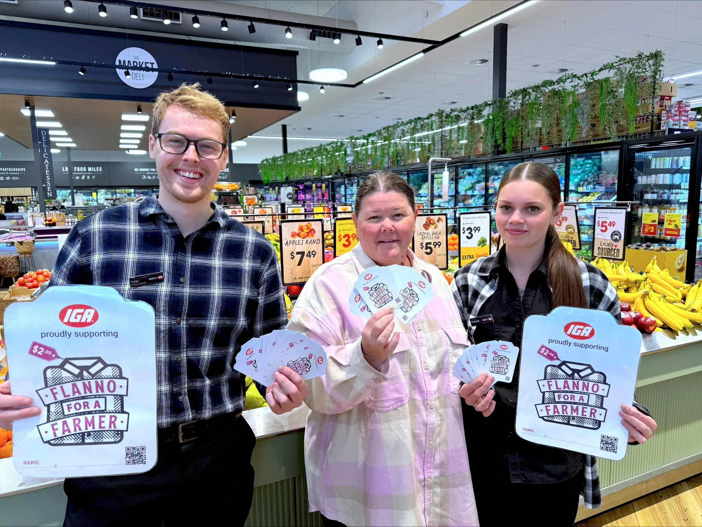 White’s IGA team members Tyler, Donna and Attaiyah help promote the ‘Flanno for a Farmer’ which will run across IGA stores.