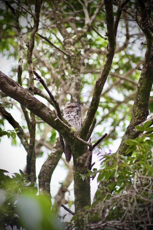 Meanwhile, the resident Mary Cairnross Scenic Reserve carpet python was sunning itself last week. At the same time a glorious Twany frogmouth blended into the trees. Their plumage is mottled grey, white and black. The feather patterns help them mimic dead tree branches. Their feathers are soft, like those of owls, allowing for stealthy, silent flight. They have stocky heads with big yellow eyes.